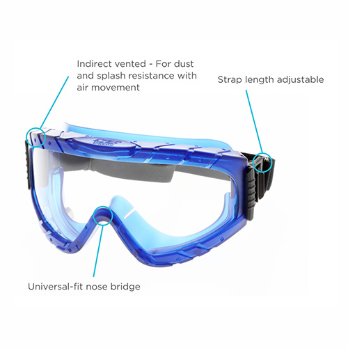 Multi-Functional Splash & Impact Safety Goggles. Blue Frame & Anti Fog Clear Polycarbonate Lens.