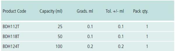 •  Graduations are screen printed in black to ISO 385 Class B accuracy