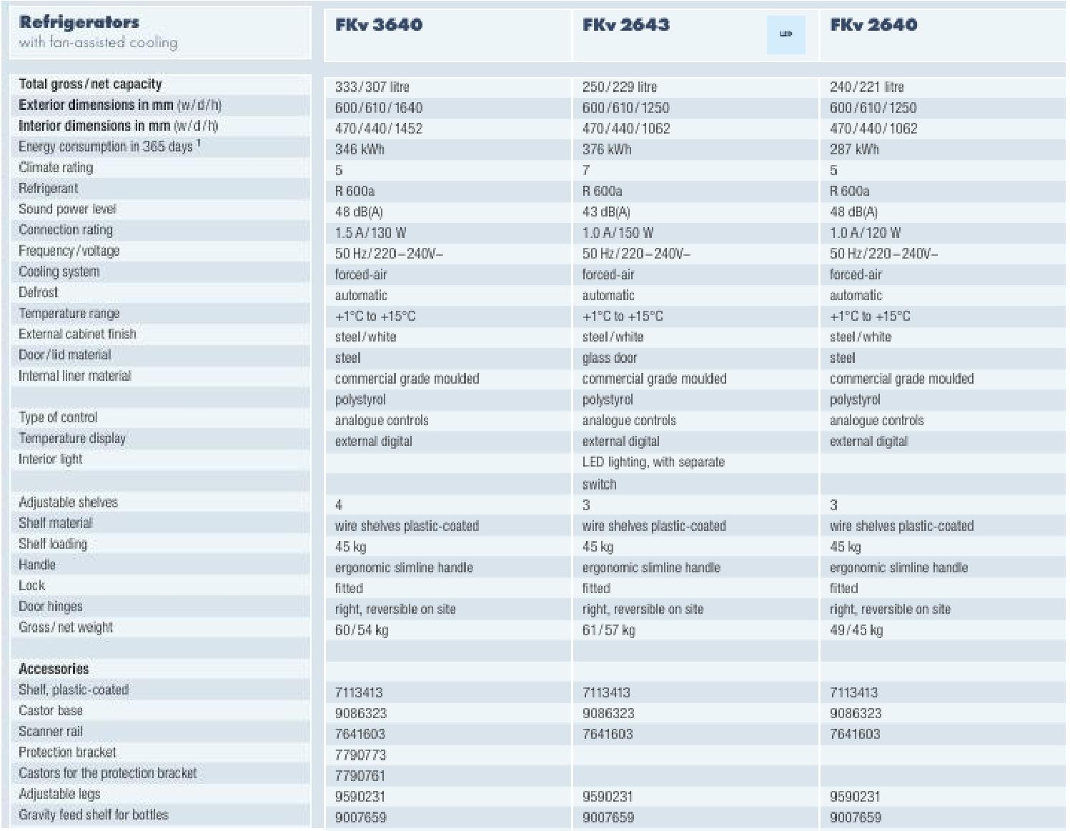 • The use of highly efficient LED lighting reduces the total energy consumption of the FKv(sl) glass door appliances by up to 30 percent compared to similar